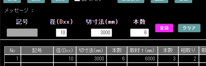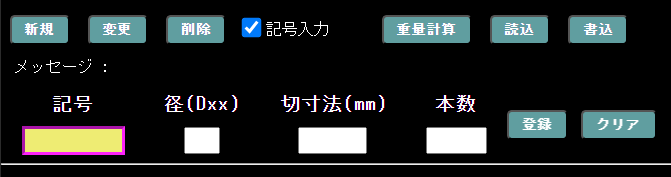 入力に関する操作部分は、下記図のテキスト入力の「記号」~「本数」とボタンの「登録」「クリア」で(これまでの「分類」はありません。)、そして入力・操作に関するエラーなどのメッセージが表土される「メッセージ」で構成される。