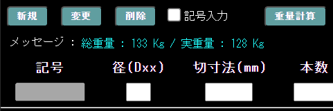 「重量計算」のボタンは、入力してテーブルに表示されているデータの取り材の「総重量」と「実重量」を計算して表示する場合にクリックする。